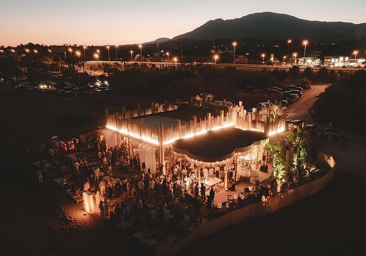 Salduna Beach sits just east of Estepona, near Benamara, in a discreet stretch of coastline that feels private and serene. White timber pergolas, linen shades and soft music set the tone for an evening defined by calm.